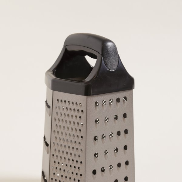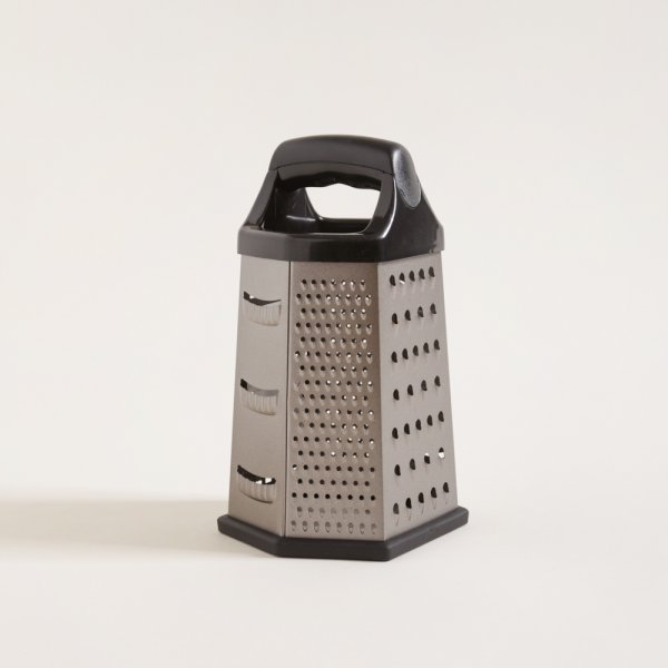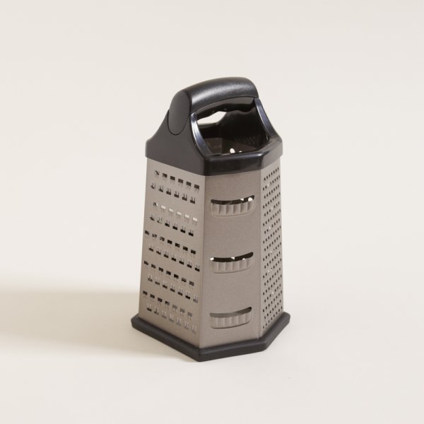 Rallador color champagne de forma hexagonal con agarre superior de plástico y base antideslizante.